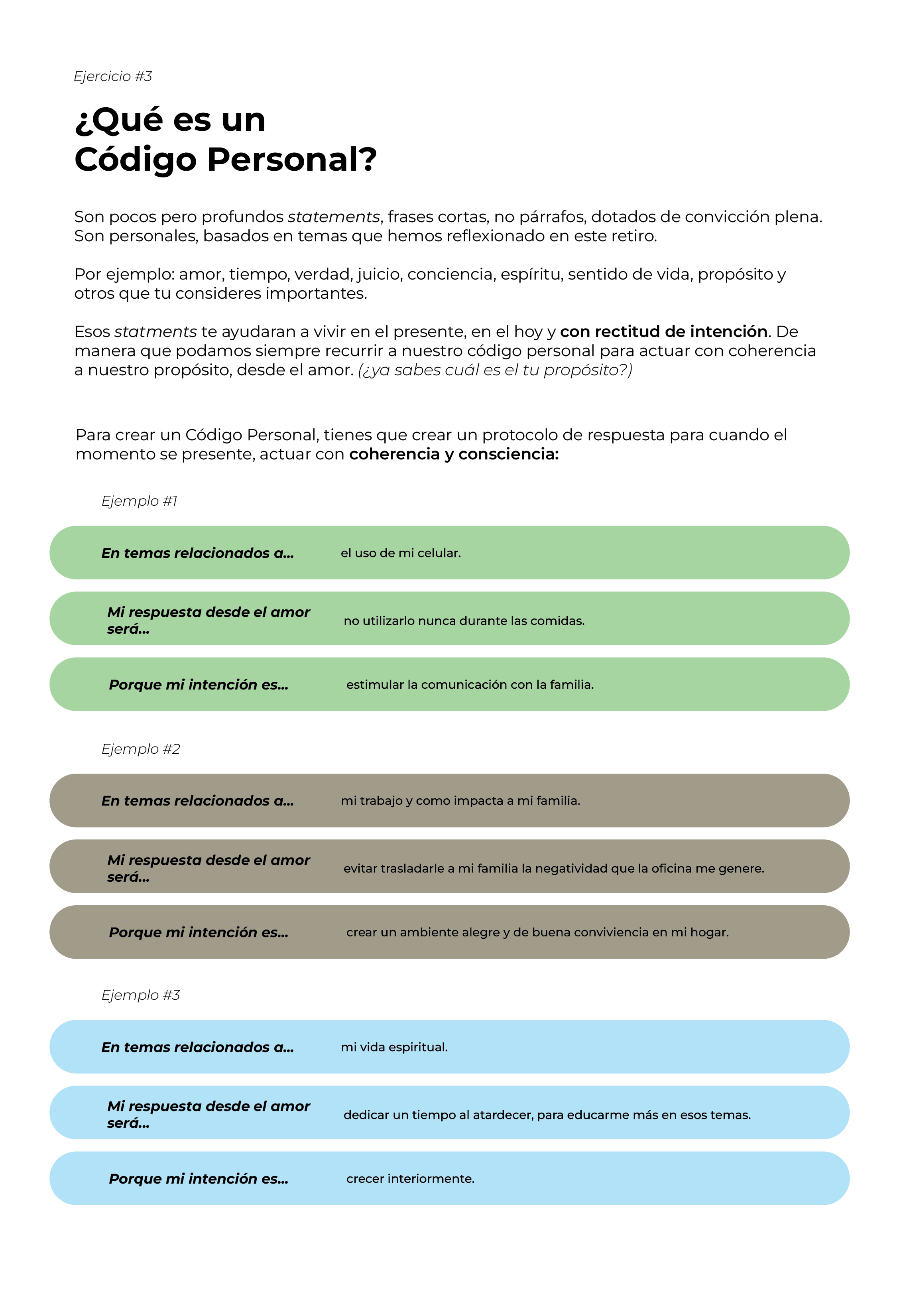 "A manera de resumen, primero escuchamos una dinámica que representaba una “auditoría” de nuestra vida. Seguidamente, realizamos el ejercicio de las “pepitas de oro”, donde colamos todas las obras de nuestra vida y extrajimos de ellas su esencia, el amor. Ahora, al escuchar la plática, haremos el ejercicio de crear nuestro código personal."